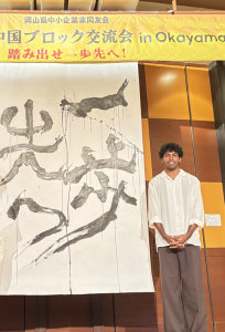 | 中等教育学科3年生のラヴィンドゥ・イーシャード・ウィクラマシンハさん(スリランカ共和国出身)が、岡山県中小企業家同友会「第4回 青年部 中国ブロック交流会」(9月27日開催)に招かれ、「踏み出せ一歩先へ!」というテーマで書道パフォーマンスを行いました。長さ2メートル、幅1.5メートルもある大きな書道用紙に、全身を使って力強く「一歩先へ」と書き、参加者から大きな歓声を浴びました。 |