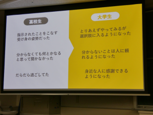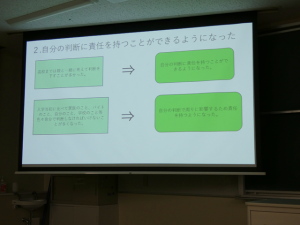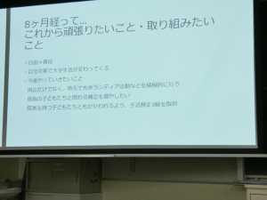| 一人暮らしを始めて生活リズムが少し崩れたり、友達が増えたり、バイトを始めたことで金銭感覚が変わったり、日本各地を旅してみたり・・高校生までにはなかった多様な体験を通じてその人なりのポジティブな変化=成長がみられたようです。 プレゼンも随分と上手くなりました。教育学部は活動型の授業が多いので、あっという間に表現力とコミュ力が高まります。 来年度も自分磨きに励んでほしいです。 |